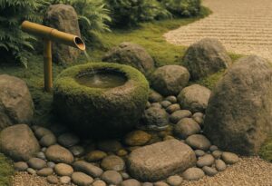 Klassische Elemente wie Chōzubachi (Wasserbecken) oder Shishi-odoshi (Wasserschlag) bringen Lebendigkeit. Großsteine oder Trittsteine sorgen für rhythmische Wege und eine stabile Struktur im Garten.