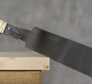 Eine japanische Längsschnittsäge („Tatebiki Noko“) wird verwendet, um Holz entlang der Maserung zu schneiden. Japanische Sägen schneiden auf Zug, was präzise und kontrollierte Schnitte mit wenig Kraft ermöglicht.